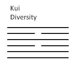 Kui is interpreted by Master Huang to mean”Diversity.” Its actual meaning is “to go against or oppose.” This happens when people have differing points of view. The I Ching indicates that this is a positive thing. There is strength in diversity. One Chinese saying suggests that we “seek harmony in diversity and good fortune will follow in little ways.” And I particularly like: “resolving diversity should be as natural as the clouds accumulating and bringing down the rain.”