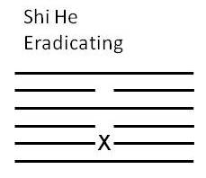 The hexagram I first received is pictured here. Its Chinese name is Shi He which Master Huang translates as “Eradicating.” Loosely translated this means “removing an obstacle to peace and harmony.” The removal or eradicating is done justly and swiftly. When we look at the two trigrams which compose the hexagram (the pair of three-line figures), we see that Li, or Fire sits on top of Zhen, or Thunder. This is like a thunderbolt striking swiftly to eradicate the obstruction.