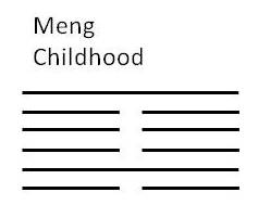 The approached qua is Meng or “Childhood” pictured here with the changed line in place. The two trigrams (three-line diagrams) are Kan or Stream on the bottom and Gen or Mountain on top. The image here is of a spring flowing out from the base of a mountain. There is a freshness, a newness about this image. It is like the innocence of childhood; Master Huang uses the image of “uncarved jade” to describe the sense of this gua. The interpretation here is to carefully mold the child through an education process to bring out the original wisdom hidden in the child. This is a slow and deliberate process; again impetuosity needs to be tempered with deliberation.