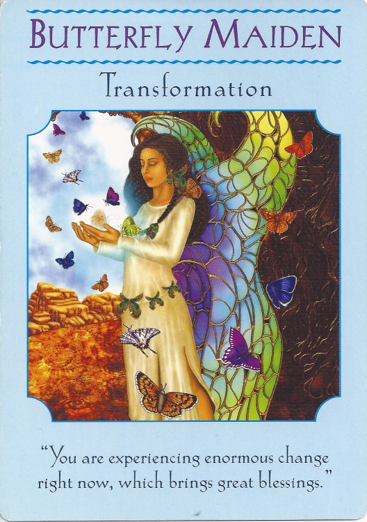 First I drew Butterfly Maiden from the Doreen Virtue Goddess Guidance Oracle Cards. No surprise as this card is all about “transformation.” This is what I wrote about the card, pictured here: